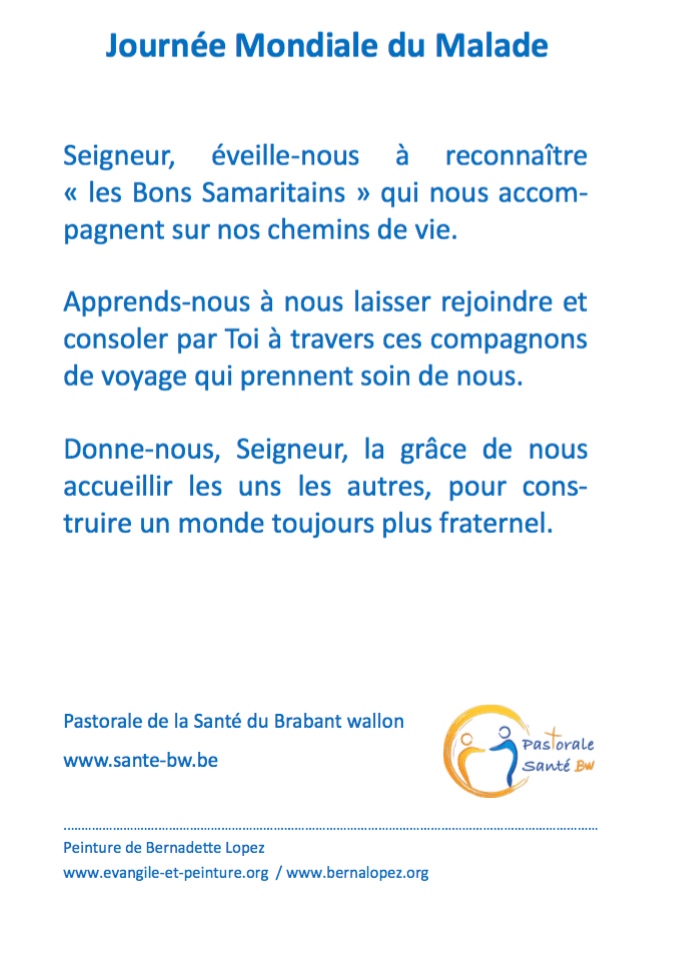 Les cartes prières réalisées à l’occasion de la JMM (dont vous avez le recto ci-dessus) sont à disposition dans toutes les paroisses en Brabant wallon pour les personnes malades. N’hésitez pas à les demander par mail à la pastorale de la Santé : sante@bwcatho.be