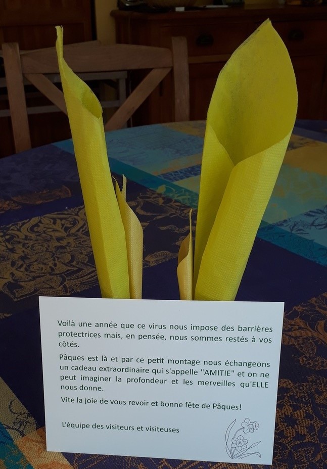 Pour la fête de Pâques au cœur des maisons de repos et chez les personnes âgées à domicile, de nombreuses initiatives ont été prises par les visiteurs dans le Brabant wallon. Cela a été à chaque fois une belle occasion pour les visiteurs de se retrouver alors qu’ils ne peuvent plus se voir entre eux depuis de nombreux mois.