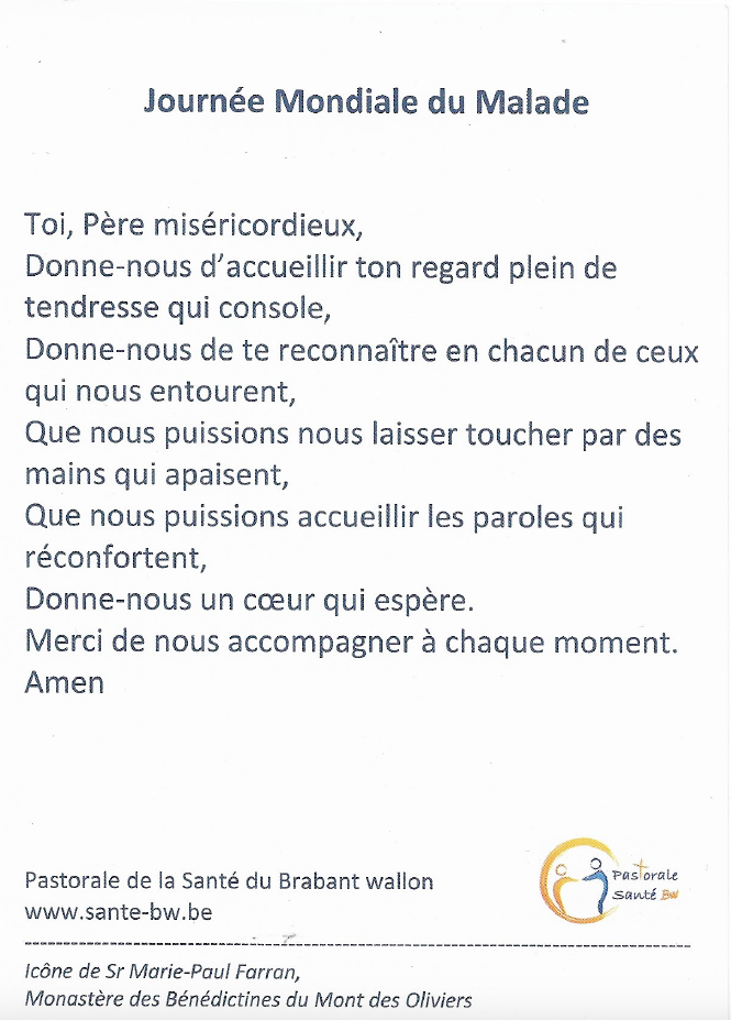 A l’occasion de la Journée Mondiale du malade, notre service pastoral de la Santé a réalisé une carte/prière qui sera donnée aux malades et résidents que les visiteurs et aumôniers accompagnent dans les hôpitaux et maisons de repos. Elle rappellera ainsi à chacun que notre Dieu est un Dieu de miséricorde qui regarde toujours ses enfants avec un amour de père.