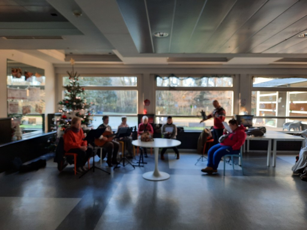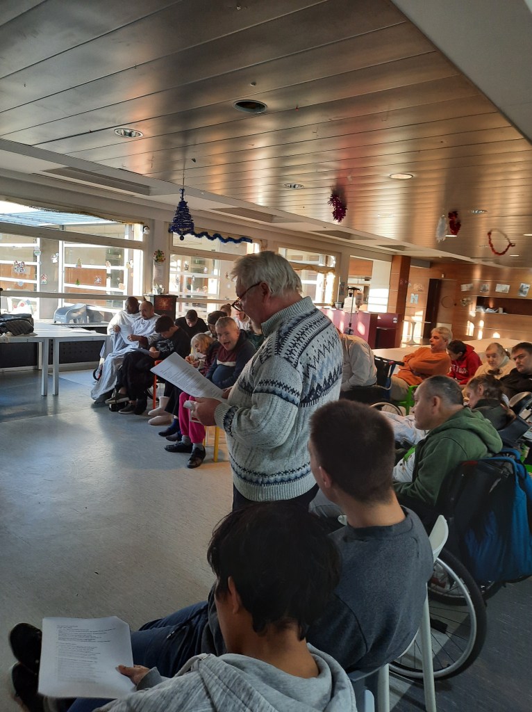 Ce samedi 17 décembre, la chorale de la paroisse de Blanmont est venue aux Renardeaux* pour chanter Noël. Thilda à la guitare, accompagnée de Réginald au violon, et quelques bons chanteurs Eliane, Louise, Magda et Marguerite qui ont apporté joie et chaleur de Noël à nos amis des Renardeaux. A leur tour ils nous ont chanté un air appris pour Noël : « Bons baisers de Fort-de-France » de la Compagnie Créole. Super!