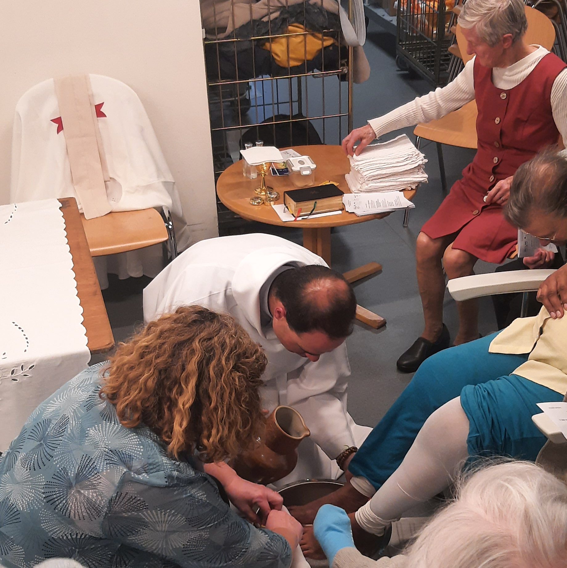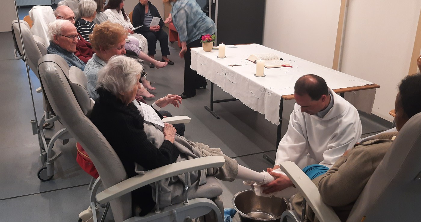 Ce jeudi saint, les patients ont participé activement à celle -ci. En effet, nous avons célébré la sainte cène. Le père Marc est passé aux pieds de celles et ceux qui le désiraient afin de leur « laver les pieds » comme Jésus l’a montré à ses disciples. Quel beau signe d’humilité ! Certains patients vivaient pour la première fois, ce geste pourtant bien connu.