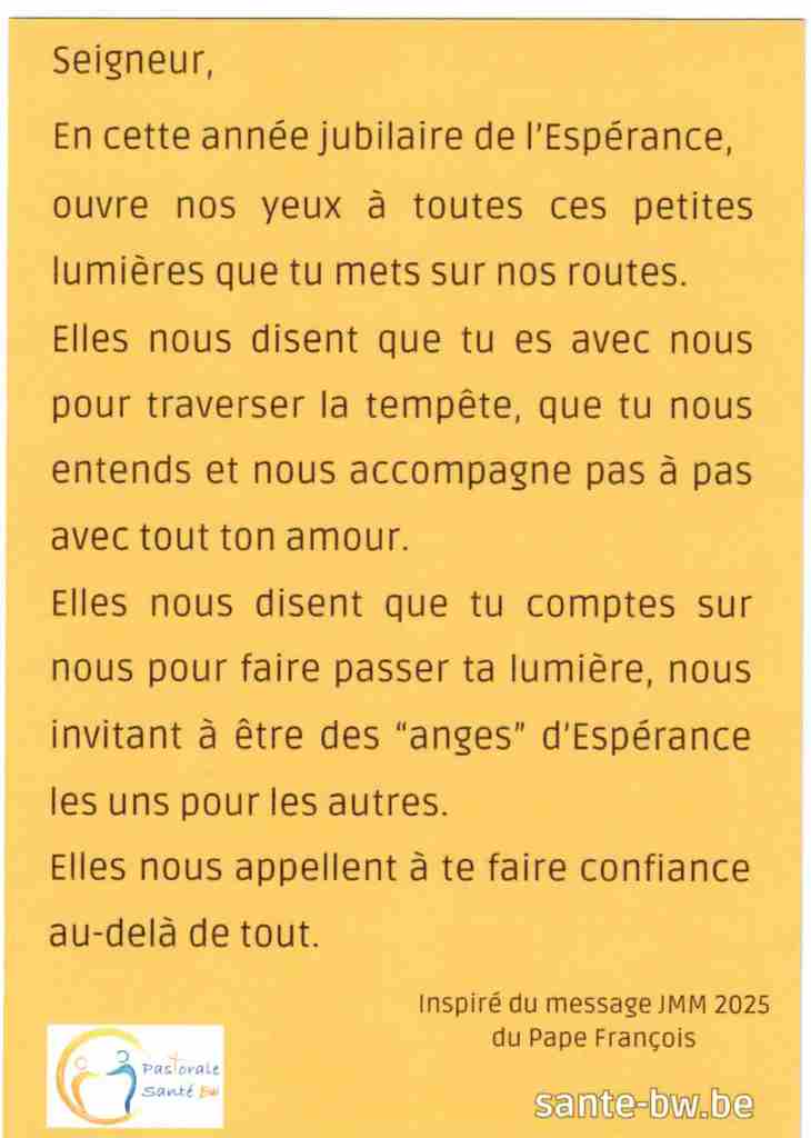 Faisons-nous tous pèlerins d’espérance pour nos proches malades, fragilisés par le grand-âge ou isolés. Voisin, grand-parent, résident en institution…ils attendent notre visite, coup de téléphone ou simple marque d’attention.