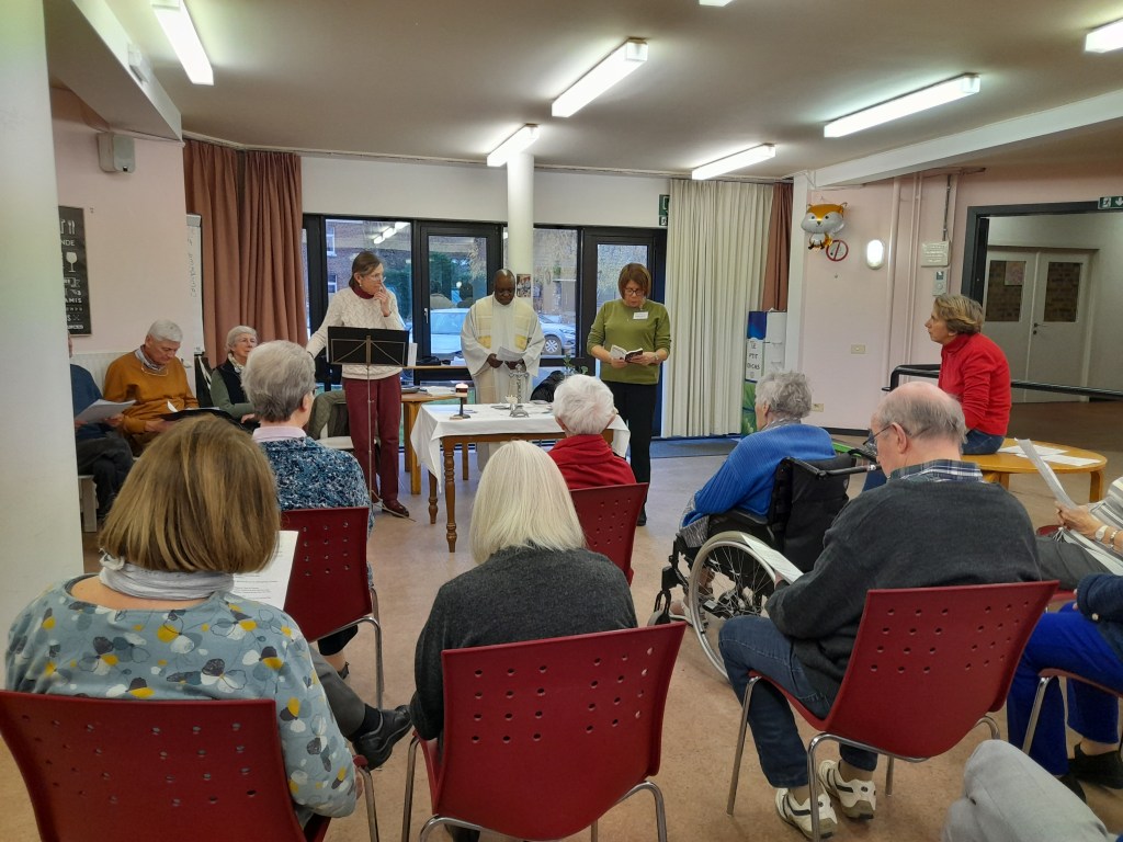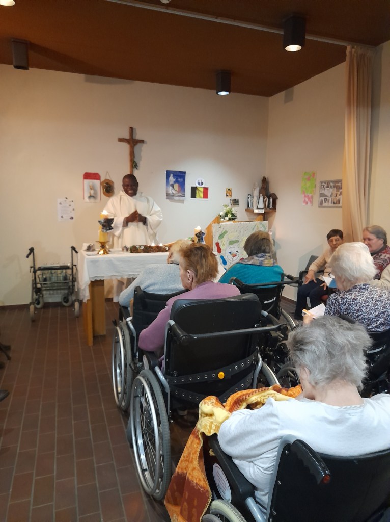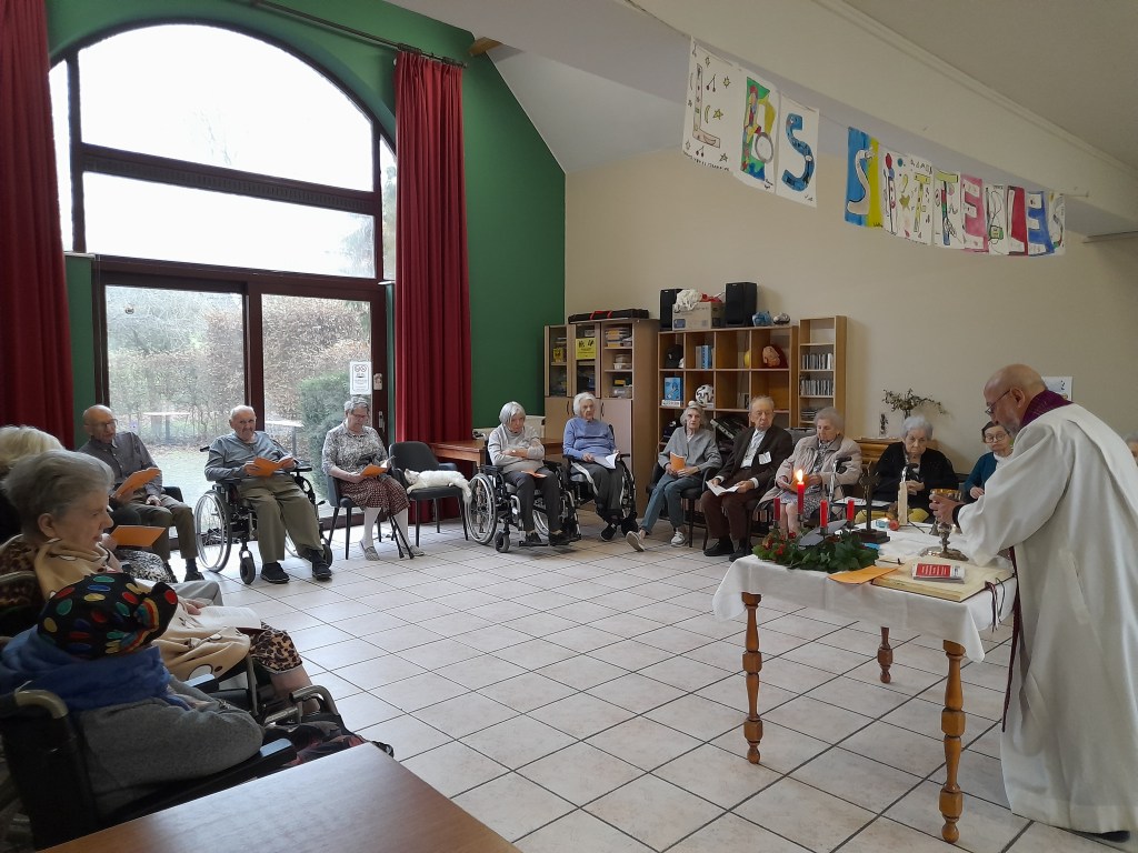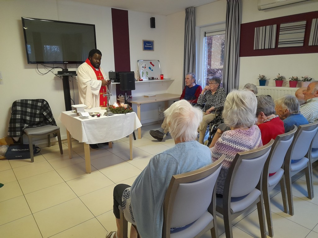 L’homélie de l’abbé Alain a invité les résidents à préparer le chemin du Christ en devenant eux aussi des pèlerins d’espérance par des actions concrètes à leur portée. Chacun a reçu une carte reprenant un verset et une action concrète à faire pour aller vers les autres et les aider. L’exemple que je retiens est celui d’une résidente, dont le visage s’est illuminé en lisant la carte : elle a montré un grand sourire, en disant “oui, je vais faire cela !” L’action écrite sur sa carte-prière était : »Sourire à la voisine de chambre et lui proposer de l’aide ». » Isabel Navarro